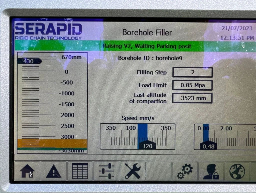 Pozycjonowana maszyna rozpoczyna pracę od dokładnego pomiaru otworu – określa jego głębokość i strukturę gruntu. W razie potrzeby tłok zagęszczający oczyszcza otwór z osypanego materiału, przygotowując go do bezpiecznego, równomiernego wypełniania.