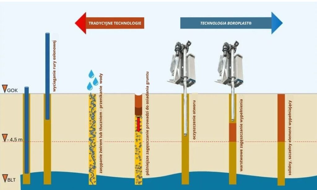 W technologii BOROPLAST®  otwór po sondowaniu jest przygotowywany do wypełnia. Specjalny, innowacyjny materiał uszczelniający BOROPLAST®  wsypywany jest warstwami i mechanicznie zagęszczany przy pomocy ubijaka. Efektem jest trwałe, gęste i szczelne wypełnienie otworu – stabilne i odporne na przenikanie wody.